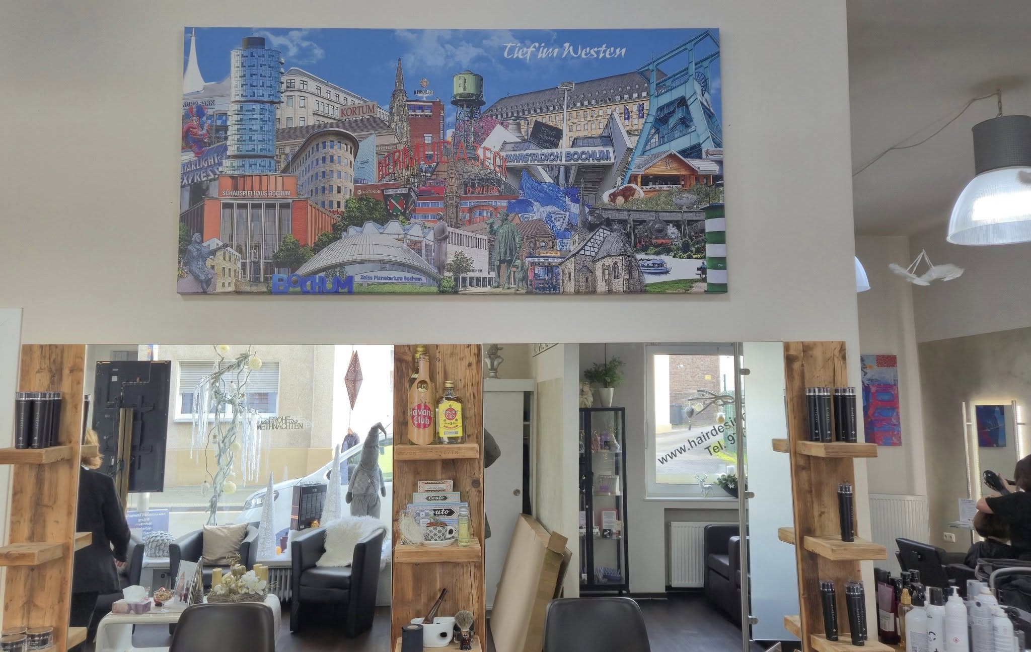 Neu ausgestattet haben wir den Friseursalon Hair Design von Monica Da Silva in Bochum Langendreer. Eine 180cm breite stadtcollage von Bochum trohnt nun über den Köpfen im Herrenbereich. Dazu eine Illustration von Breakfast im Ruhrpott im Bereich der Damen.